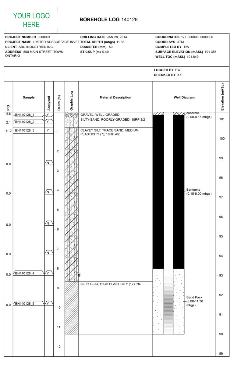 - Borehole logs that document soil and rock layers, sampling results, and installation details