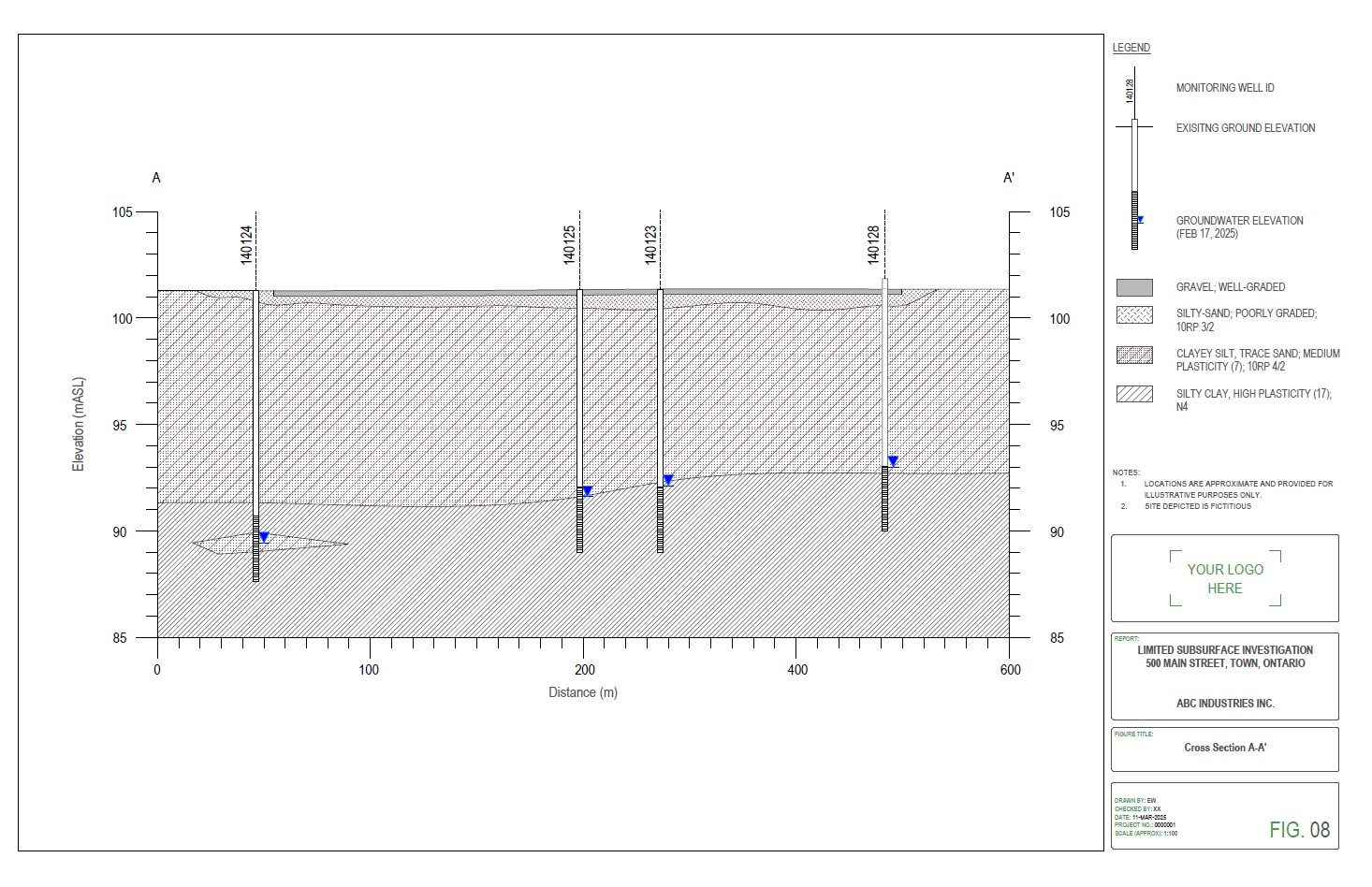 - Geological cross-sections to visualize subsurface conditions and stratigraphy